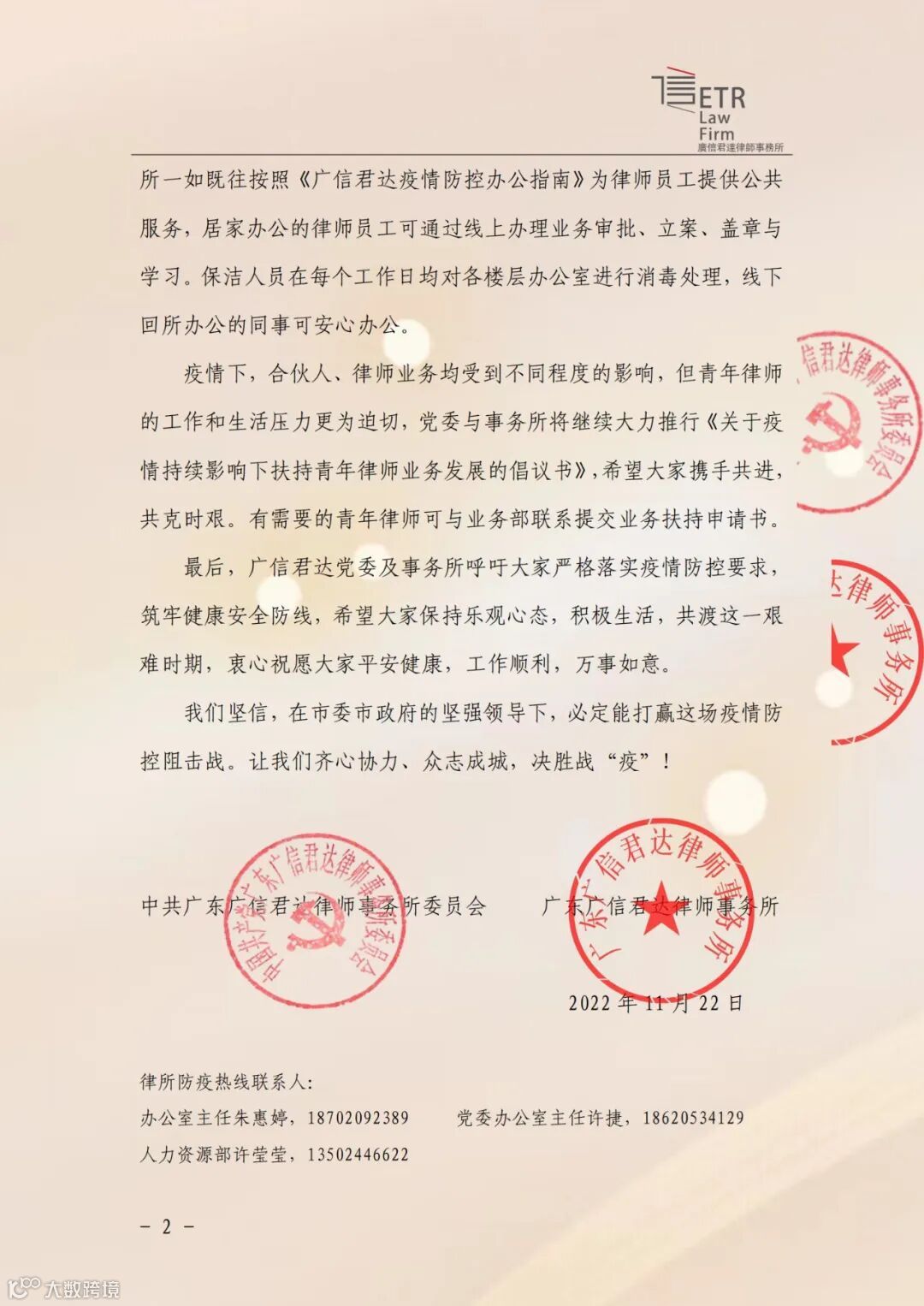 2022年11月22日,广信君达党委及事务所向全所律师员工送上《同心抗疫 共克时艰——致广信君达家人的一封信》,并“云推送”至处于封控中的同事手中。“短暂的管控是为了确保大家的平安健康和社会的安全稳定”“你不是一个人在‘战斗’,广信君达党委及事务所永远是大家的坚强后盾”“感谢你们‘疫’无反顾的担当,感谢你们‘疫’不容辞的坚守”……见字如见面,字字传真情,极大缓解了家人们焦虑之心,鼓足团结战“疫”士气。
