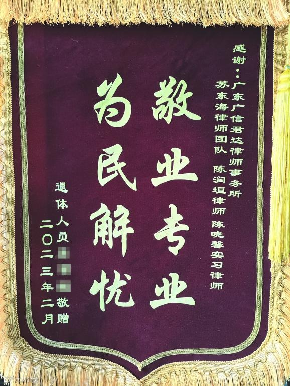 近日,广信君达律师事务所苏东海律师团队的陈润垣律师、陈晓馨实习律师收到来自客户叶女士(化姓)的感谢信及锦旗。退休人员叶女士对两位代理人历时半年,不辞辛劳,最终为其追回近30万元养老款表示充分的肯定及衷心的感谢。