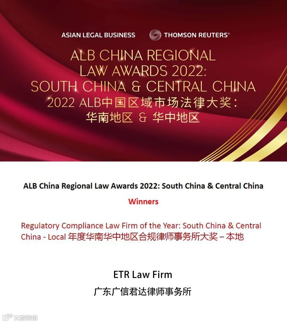 广信君达荣膺2022 ALB“年度华南华中地区合规律师事务所大奖-本地”