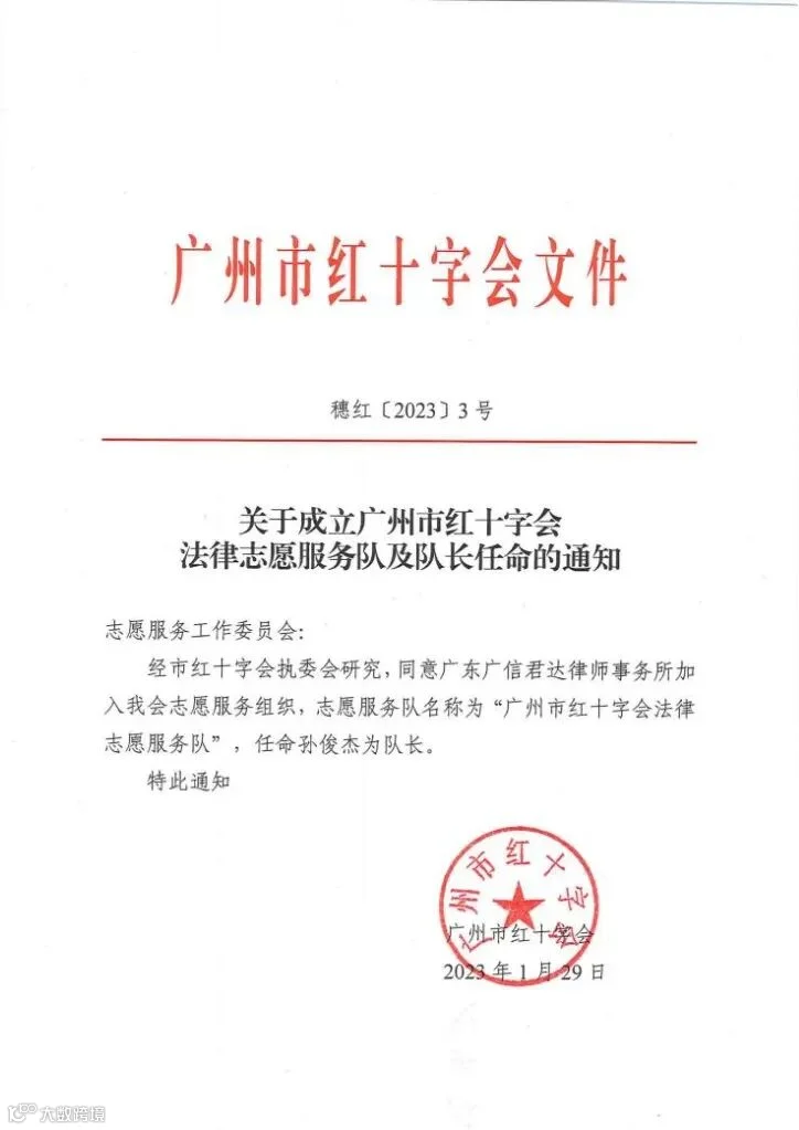 2023年1月29日,经广州市红十字会(简称“广州市红会”)执委会研究,同意广信君达律师事务所加入该会志愿服务组织,成立“广州市红十字会法律志愿服务队”,任命本所孙俊杰律师为队长,陈建民、张海鹏、张捷、赖明星、王子文、朱嘉兴等律师及实习人员为队员。