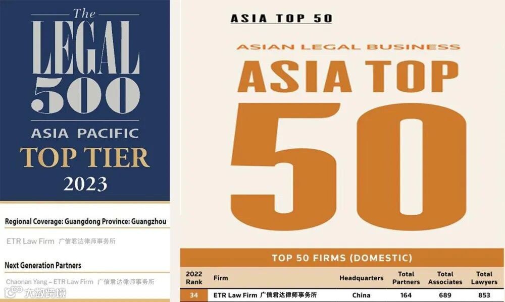 广信君达律师事务所凭借出众的专业实力、优质的法律服务及客户口碑,分别再度荣登国际权威知名法律评级机构《法律500强》(The Legal 500)“广州地区:最值得推荐的律师事务所榜单”,汤森路透旗下《亚洲法律杂志》(Asian Legal Business)“亚洲最大50家律所”榜单。