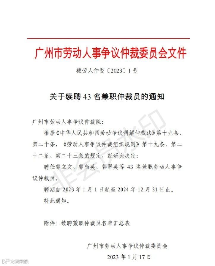 近日,经广州市劳动人事争议仲裁委员会研究决定,广信君达律师事务所合伙人朱滔律师、黄恒律师被广州市劳动人事争议仲裁委员会续聘为兼职仲裁员,聘期自2023年1月1日至2024年12月31日。