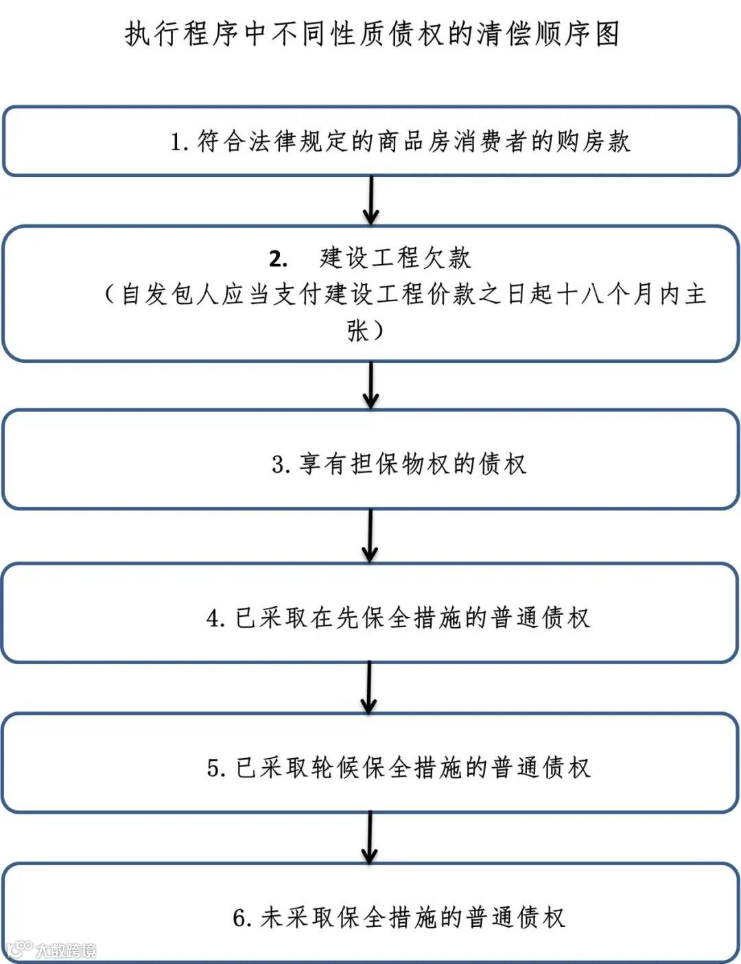 综上,在执行程序中,多份生效法律文书确定金钱给付内容的多个债权应当按照如下顺序进行清偿:①符合法律规定的商品房消费者的购房款、②建设工程价款、③享有担保物权的债权、④采取在先保全措施的普通债权、⑤采取轮候保全措施的普通债权、⑥未采取保全措施的普通债权。