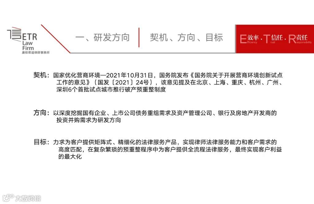 2021年10月31日,国务院发布《国务院关于开展营商环境创新试点工作的意见》(国发〔2021〕24号),该意见提及在北京、上海、重庆、杭州、广州、深圳6个首批试点城市推行破产预重整制度。在意见发布之后,全国各地再次涌现预重整制度讨论热潮。