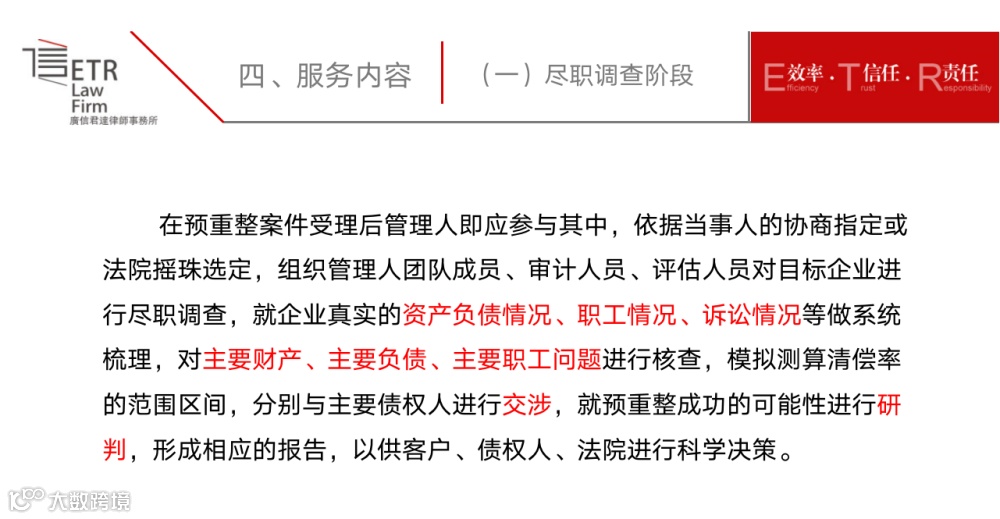 广信君达律师事务所清算与破产业务部的主要服务对象是有债务重组及投资并购需求的中高端客户,包括有债务重组需求的国有企业、上市公司和有投资并购需求的资产管理公司、房地产开发商及其他有重整需求的公司。上述企业主要有收购式重整和收取固定收益这两种参与投资的方式。