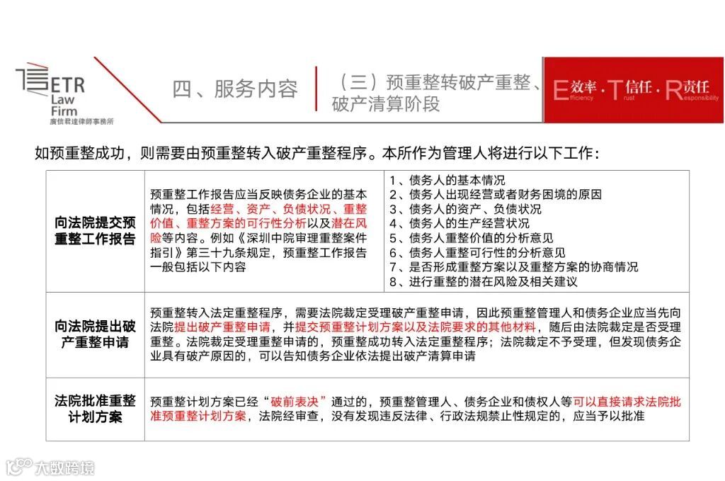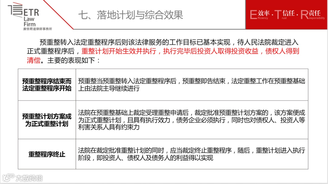 预重整转入法定重整程序后,该法律服务的工作目标已基本实现,待人民法院裁定进入正式重整程序,重整计划开始生效并执行。执行完毕后投资人取得投资收益,债权人得到清偿,至此项目落地。