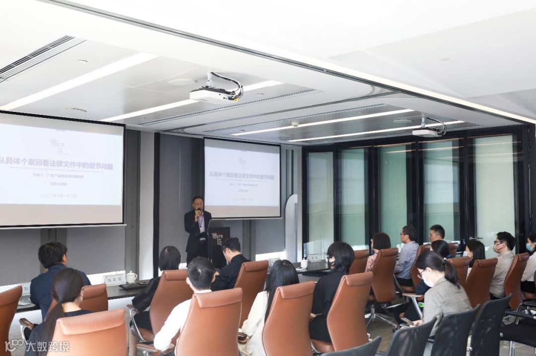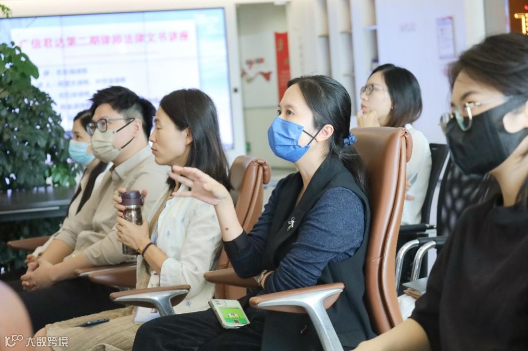 2022年10月13日,广信君达金融与保险、税务法律专业部,债市后端法律研究中心联合举办“从具体个案会回看法律文件中的细节问题、涉外非诉英语法律文书拟定”专题讲座。讲座由广信君达律师事务所合伙人何浩太律师、专职律师叶世宝主讲,实习律师孙楚杭主持。高级合伙人苏东海、侯榆、向金波律师,合伙人饶芙蓉律师受邀出席分享。