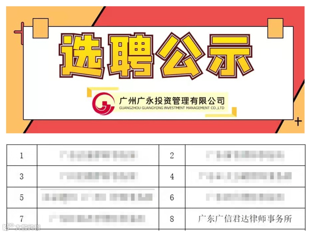 近日,广州广永投资管理有限公司(简称“广永投资”)2022-2024年度律师事务所备选库入库机构的选聘工作已顺利完成。期间,广信君达律师事务所委派高级合伙人侯榆律师,合伙人李嘉亮、江晓璐、王舒律师牵头组建律师团队,参加竞聘并展示了团队在投融资和不良资产处置的众多成功案例,经过广永投资严格的筛选与入库审核后,以专业的法律知识,丰富的经验与优质的方案,获得了广永投资的认可入库。