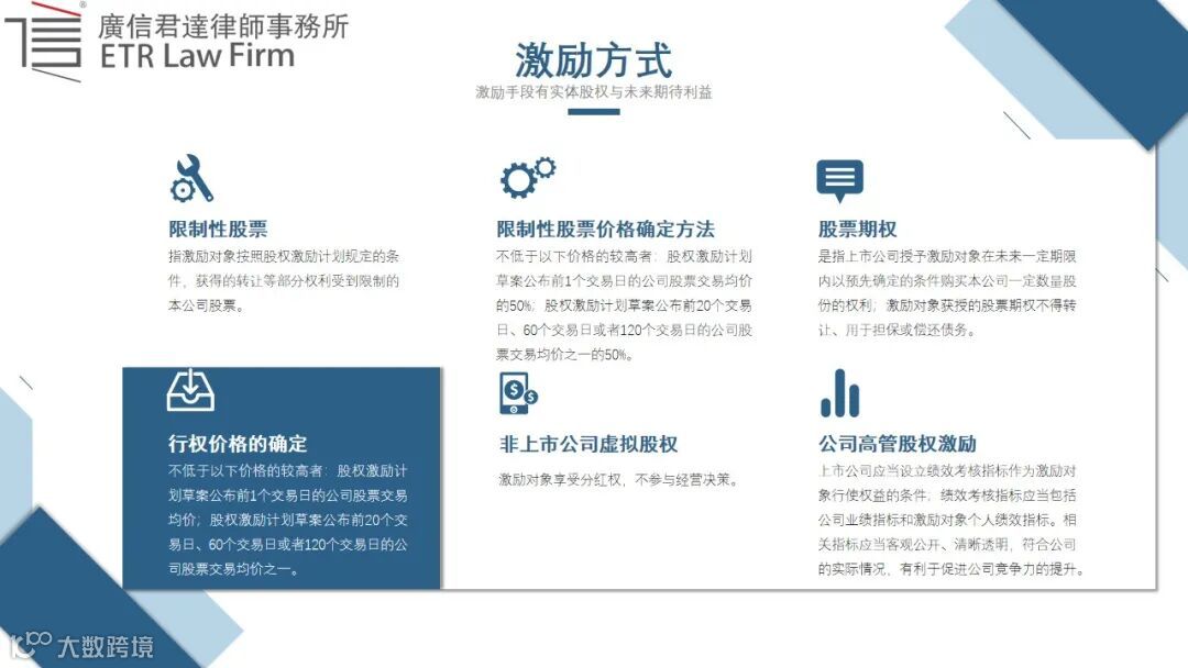 确定激励对象后,需明确激励方式,是用限制性股票方式,还是股票期权抑或是非上市公司的虚拟股权。每个激励方式都存在优缺点,只有结合企业自身的特点才能选出最适合企业的激励方式。