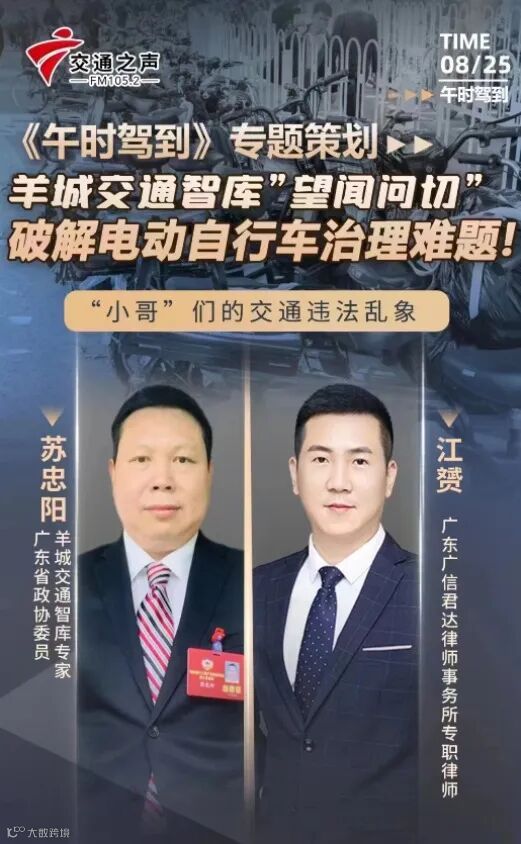 近日,广信君达律师事务所恒生团队江赟律师受邀到羊城交通广播电台“交通之声”(FM105.2)做客,与广东省政协委员、羊城交通智库专家苏忠阳一同直播,为破解外卖骑手电动自行车治理难题建言献策。
