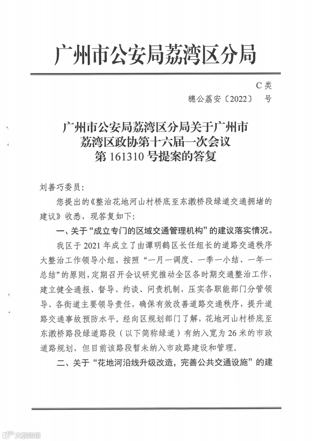 交通拥堵不但有损荔湾区的整体城市形象,更给居民群众的生产生活和出行活动造成了困扰。为此,刘善巧律师经过实地调研和考察,在荔湾区政协第十六届一次会议上提出了整治相关地段交通拥堵问题的提案。建议成立专门的交通管理机构,加大对该路段违章车辆的执法力度,并升级改造花地河沿线道路。