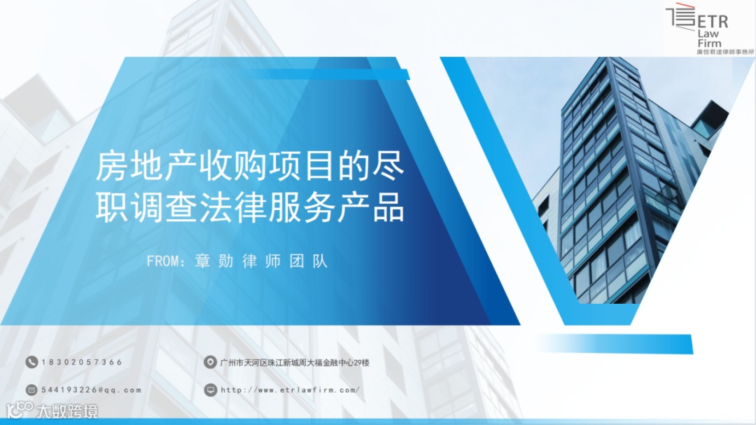 本产品可以通过模块化法律服务内容预制,为有股权或资产收购需求的房地产项目提供及时、专业、精准、高效的尽职调查法律服务。对拟收购房地产项目的客观事实和法律状态进行全面调查、分析,并向收购方提供可行性合规论证以及法律风险提示以及收购建议。