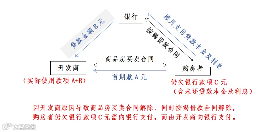 从实际的法律关系上看,按揭银行是与购房者成立借贷关系,而非与开发商成立借贷关系,按揭银行只是根据购房者的指示,将款项支付给开发商。但是根据《商品房买卖合同司法解释》第二十一条的规定,在该特定情况下,即商品房买卖合同被确认无效或者被撤销、解除,同时《借款合同》亦解除时,《借款合同》中返还款项的义务方从购房者变更成了开发商。