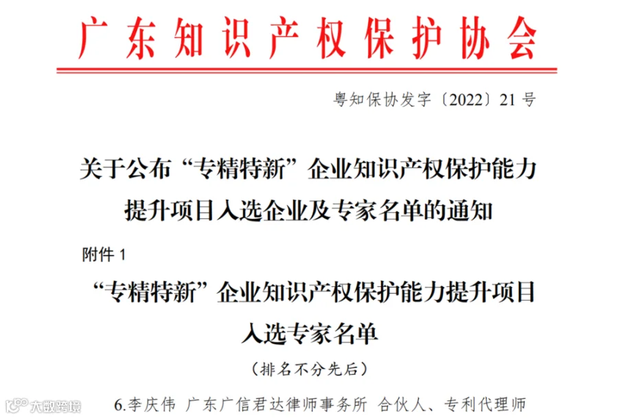 近日,为提升广东省“专精特新”企业知识产权保护能力,助力各“专精特新”企业知识产权保护与高质量发展,广东知识产权保护协会受广东省市场监督管理局(知识产权局)委托,制订《2022年度“专精特新”企业知识产权保护能力提升项目实施方案》,并向全省“专精特新”企业及协会专家库发出征集通知。协会结合专家所在机构业务类型、擅长领域、实务经验等因素,对申报专家进行了层层遴选,广信君达律师事务所合伙人李庆伟律师凭借扎实的专业知识及多年的知识产权保护实务经验入选。在接下来6个月时间里,李律师将对接辅导5家“专精特新”企业,全方位深入诊断和帮助企业提升知识产权保护能力。