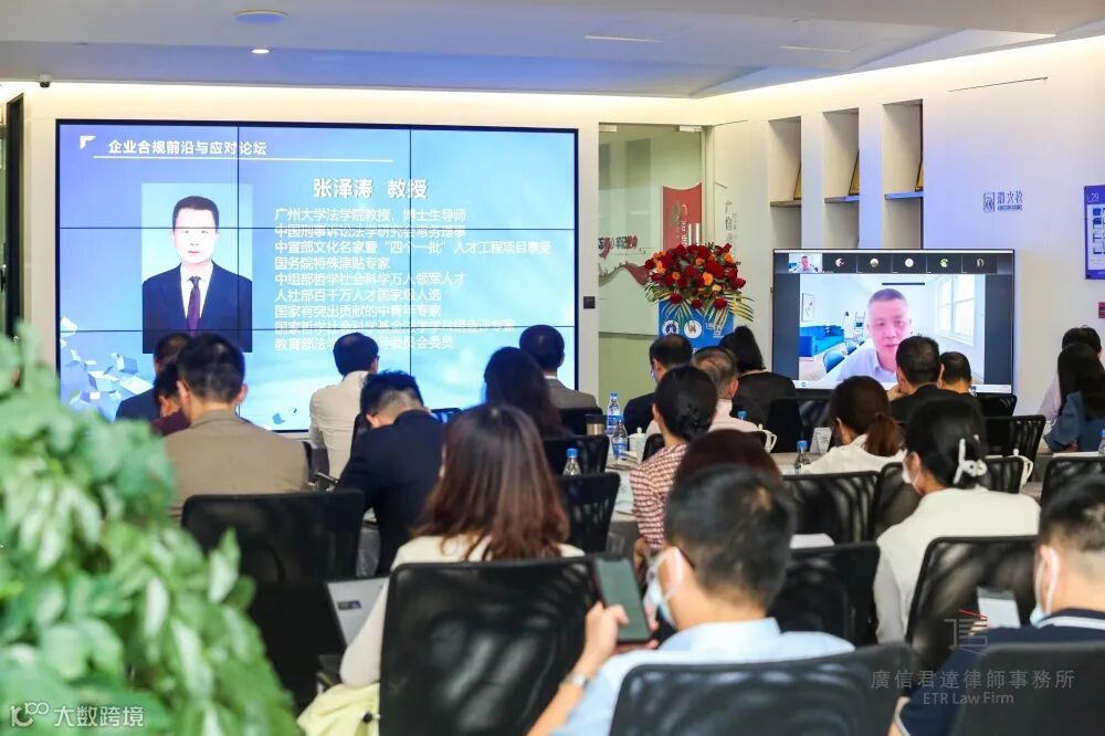 广州市律师协会副会长聂卫国,广州市总部经济协会秘书长刘国生,广州粤港澳大湾区企业廉洁与合规管理联合会副秘书长江姗,广信君达党委副书记、高级合伙人邓传远律师,广州市总部经济协会会员企业等有关领导嘉宾出席论坛。本次论坛邀请了广州大学法学院教授、博士生导师张泽涛,广州粤港澳大湾区企业廉洁与合规管理联合会代表、广州金域医学检验集团股份有限公司法务风控总监李根,广信君达管委会主任、高级合伙人苏东海律师,梁思齐律师作主题分享。