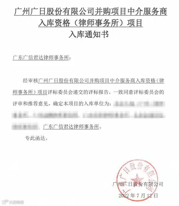 近日,广信君达律师事务所收到广州广日股份有限公司(下称“广日股份公司”)的《入库通知书》,获取广日股份公司并购项目中介服务商入库资格,成为该项目入库单位之一。