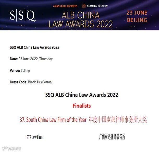 本所再度入围汤森路透旗下的《亚洲法律杂志》SSQ2022年ALB中国法律大奖名单,获得 “South China Law firm of the year 年度中国南部律师事务所大奖”提名。