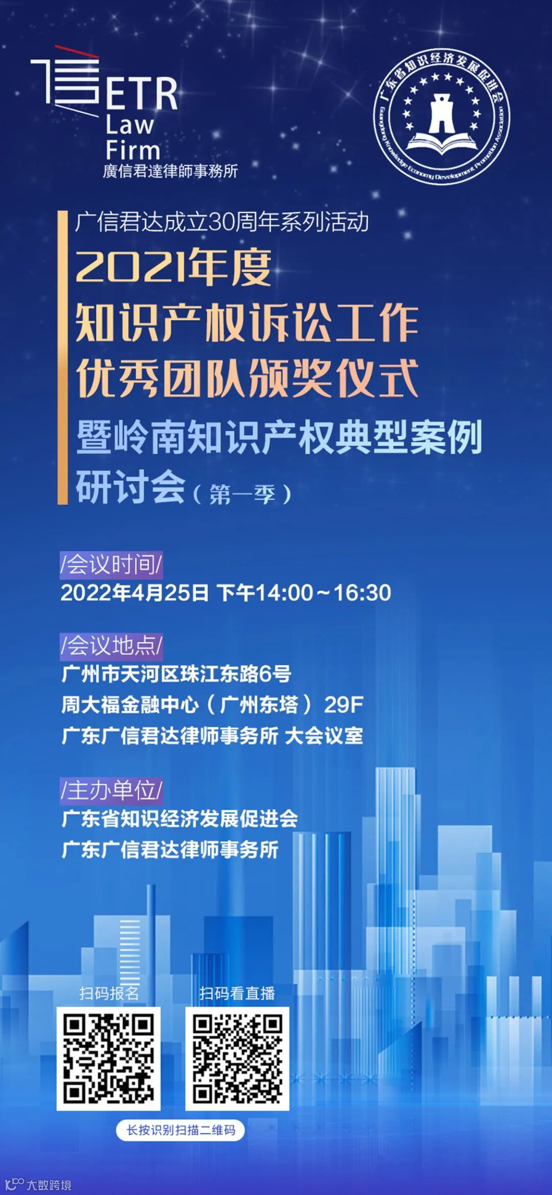 为了深入贯彻《知识产权强国建设纲要(2021-2035)》,实施知识产权强国战略,并深入挖掘岭南知识产权典型案件的学术研究价值,进一步发挥案例的指导、借鉴、示范和引领的作用,提高岭南在知识产权保护工作的法治化水平,广东省知识经济发展促进会近日评选出“2021年度知识产权诉讼工作优秀团队”,并定于2022年4月25日下午在广信君达律师事务所29楼办公室举行“2021年度知识产权诉讼工作优秀团队颁奖仪式暨岭南知识产权典型案例研讨会(第一季)”。本次研讨会也是广信君达成立30周年系列活动之一。
