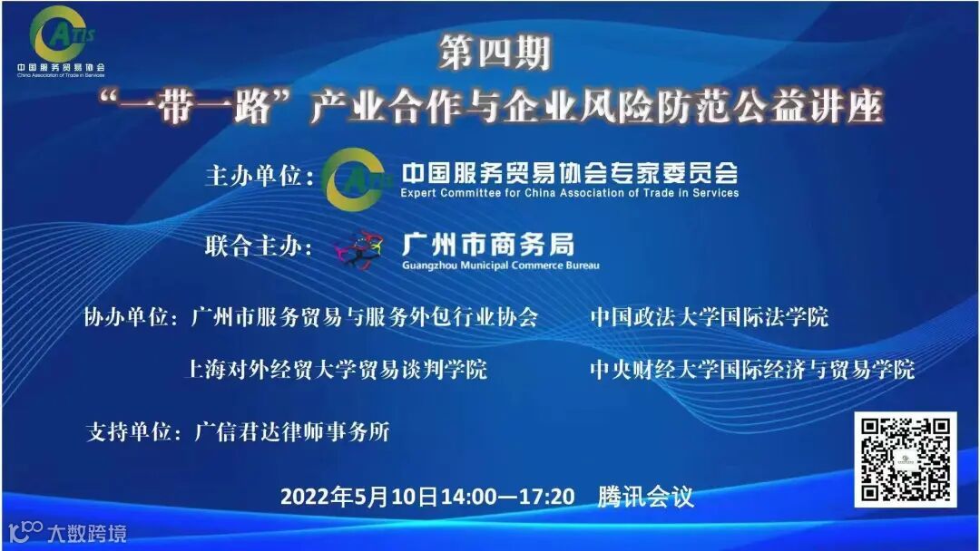 2022年5月10日下午,由中国服务贸易协会指导,中国服务贸易协会专家委员会主办,广州市商务局联合主办,广州市服务贸易与服务外包行业协会、中央财经大学国际经济与贸易学院、中国政法大学国际法学院、上海对外经贸大学贸易谈判学院协办,广东广信君达律师事务所支持的第四期“一带一路”产业合作与企业风险防范公益讲座成功举办。广信君达高级合伙人闪涛律师受邀线上参加并作主旨发言。