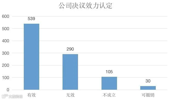 统计结果显示,2018年11月1日至2021年11月1日期间,在原告请求确认公司决议无效的964宗案件中,法院认定公司决议为有效的案件最多,共计539宗,占全体案件数量的56%;认定公司决议为无效的案件共计290宗,占比30%;认定公司决议为不成立的案件共计105宗,占比11%;认定公司决议可撤销的案件共计30宗,占比3%。由此可见,法院在公司决议无效诉讼纠纷中,一般不会轻易否定公司决议的效力。