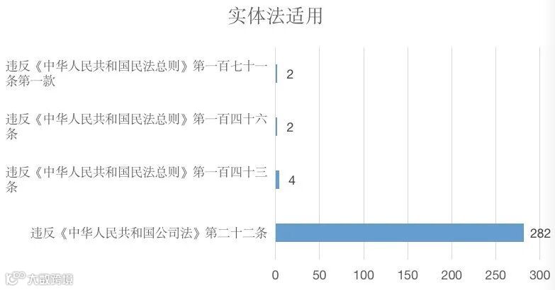 根据实体法适用的统计结果来看,对于公司决议无效诉讼纠纷案件,法院基本会适用《公司法》第22条的规定。部分案件适用了《民法总则》第143条、第146条以及第171条第1款,这三个条文涉及民事法律行为的有效要件、虚假意思表示和无权代理等问题。由此可见,《公司法》和民事一般法律规范是认定公司决议无效问题的主要法律依据。其中适用《公司法》第22条规定的案件数量为282宗,占比97%,适用一般民事法律规范的案件数量为8宗,占比为3%。