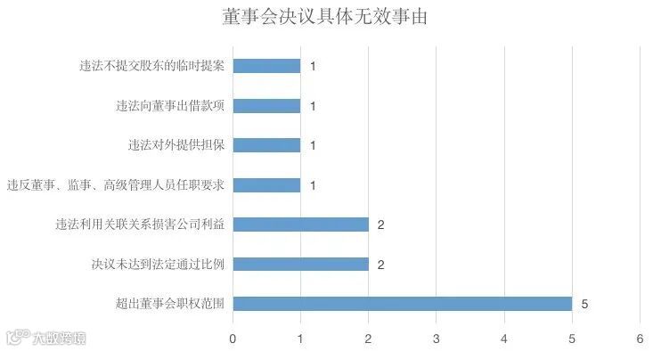 由上图可知,上述13宗董事会决议无效案件中一共存在7种具体的无效事由。其中以“超出董事会职权范围”为无效事由,认定股东会决议无效的案件数量最多,共计5宗,占比38%。案件数量排名第二的无效事由是“决议未达到法定通过比例”,共计2宗,占比15%。案件数量排名第三的无效事由是“违法利用关联关系损害公司利用”,共计2宗,占比15%。
