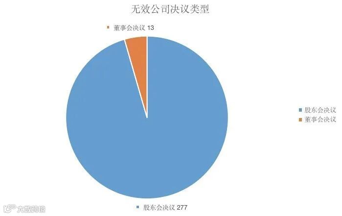 从统计结果来看,在法院认定公司决议为无效的290份生效判决文书中,股东会决议被认定为无效的案件数量最多,共计277宗,占比95%。董事会决议被认定为无效的案件数量为13宗,占比5%。由此可见,在公司决议无效诉讼纠纷中,涉股东会决议无效纠纷数量更多,这或与我国公司法采股东会中心主义立场以及公司多为股权集中型的现状有关。[1]