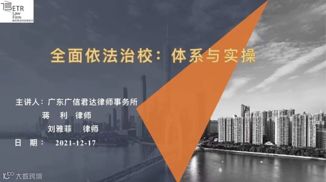 蒋利律师立足运筹团队在教育法领域的实务经验和理论研究成果,以团队新出版的《校园法律风险防控教师手册》所构建的全面依法治校体系为基础,围绕“全面依法治校:体系与实操”主题展开培训。蒋利律师以全面依法治校的背景、价值、理念为切入点,深入讲解全面依法治校体系与重点、全面依法治校的方法论、新近与教育相关的主要法律等方面内容,并结合法条和案例,对学校如何处理好第一责任人与直接责任人、法治工作与教学和管理等业务工作、法治培训和法治思维与法治方式等关系进行指导。同时,对“学生伤害事故处理”“教育惩戒”等教育领域疑难、复杂和前沿问题结合有关典型案例进行梳理和讲解,并提出了切实可用的建议。蒋律师强调,实现全面依法治校,必须牢牢把握“全面”“依法”“善治”三个关键词,从学校与学生、学校与家长、学校与教师、学校与社会等多个角度出发。