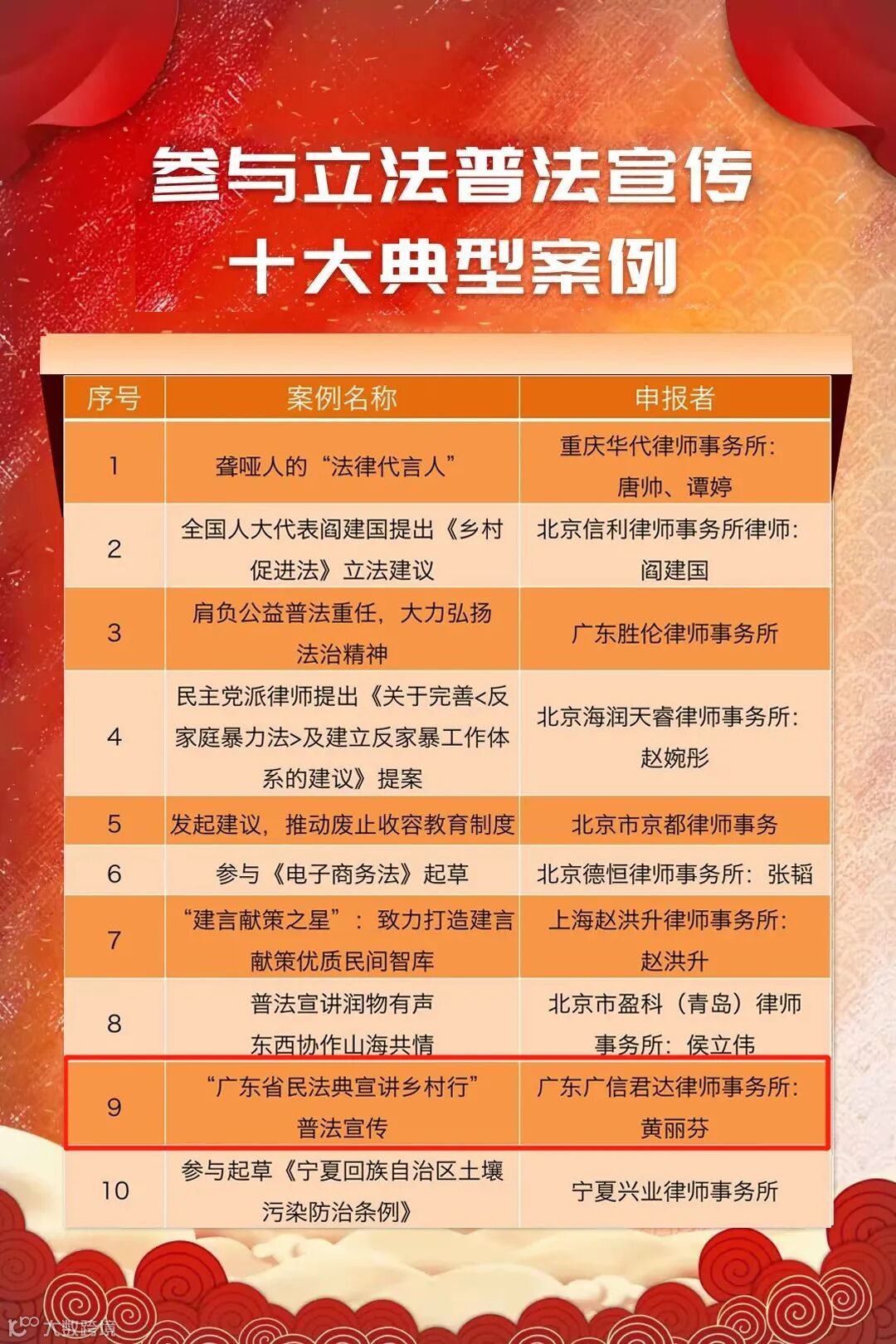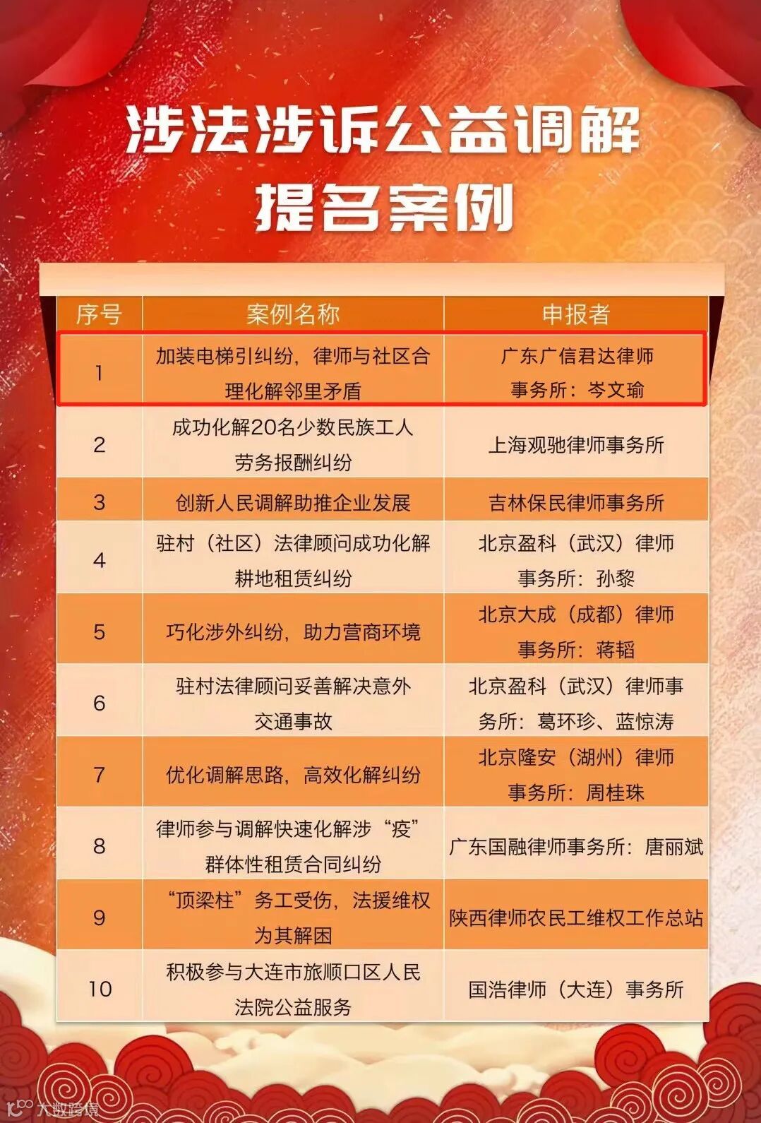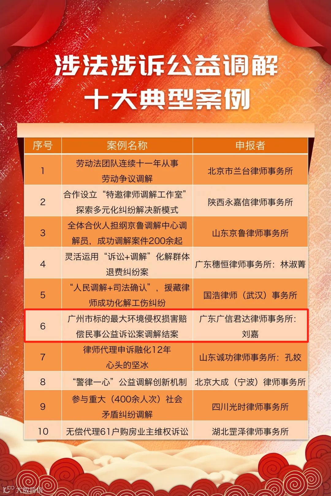 本所黄丽芬律师“广东省民法典宣讲乡村行”普法宣传案例入选“参与立法普法宣传十大典型案例”;刘嘉律师“广州市标的最大环境侵权损害赔偿民事公益诉讼案调解结案”案例入选“涉法涉诉公益调解十大典型案例”;岑文瑜律师“加装电梯引纠纷,律师与社区合力化解邻里矛盾”入选“涉法涉诉公益调解提名案例”。
