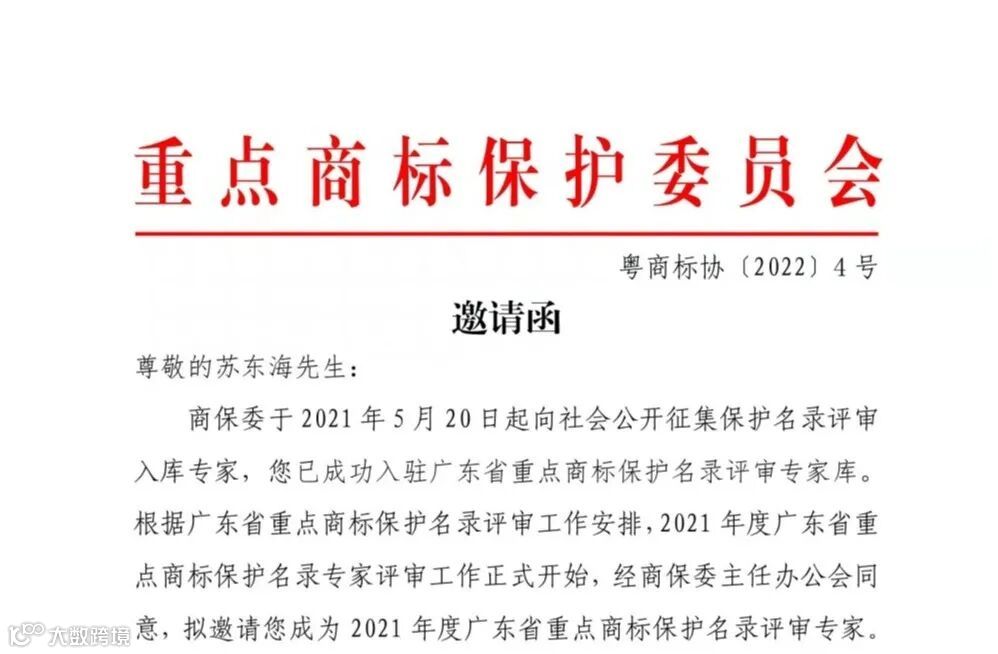 本所高级合伙人苏东海律师成功入驻广东省重点商标保护名录评审专家库,成为 2021 年度广东省重点商标保护名录评审专家。