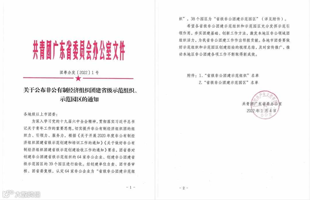 共青团广东省委办公室印发《关于公布非公有制经济组织团建省级示范组织、示范园区的通知》(团粤办发〔2022〕1号),本所被认定为“省级非公团建示范组织”。