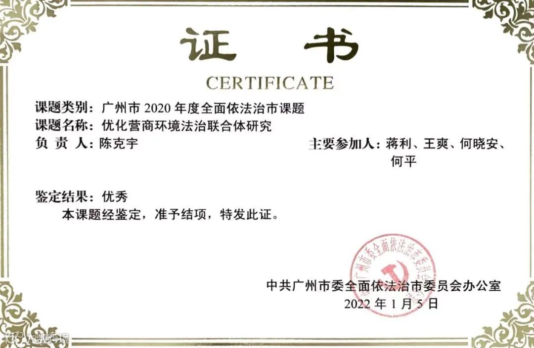 本所蒋利律师作为主要承办人全程参与了广州市律政营商环境研究院承接的《优化营商环境法治联合体研究》课题研究工作,该课题被中共广州市委全面依法治市委员会办公室评为优秀。