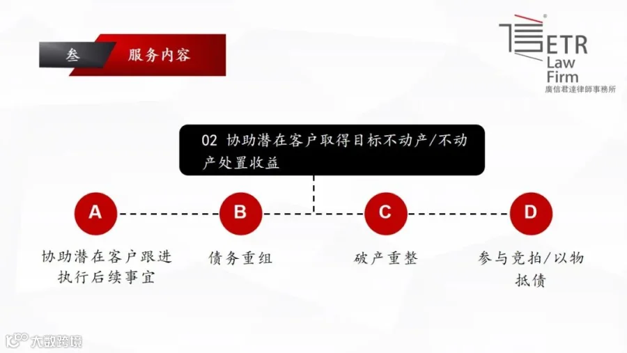 (二)对债权市场权利受限的特殊目标不动产有投资意向的潜在客户,包括想要在通过“拿房/地”后的经营、再处置,或者在未能“拿房/地”的情况下处置变现目标不动产,实现投资收益的潜在客户。