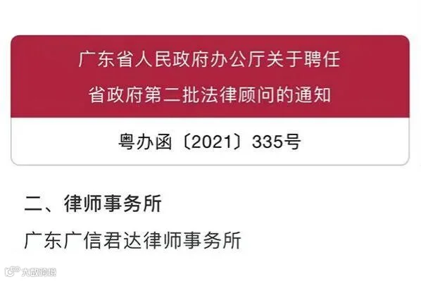 2021年12月9日,广东省人民政府(简称“省政府”)发布通知,根据《广东省政府法律顾问工作规定》(广东省人民政府令第207号)规定,聘任6名专家学者及包括广信君达律师事务所在内共6家律师事务所为省政府第二批法律顾问,聘期3年。
