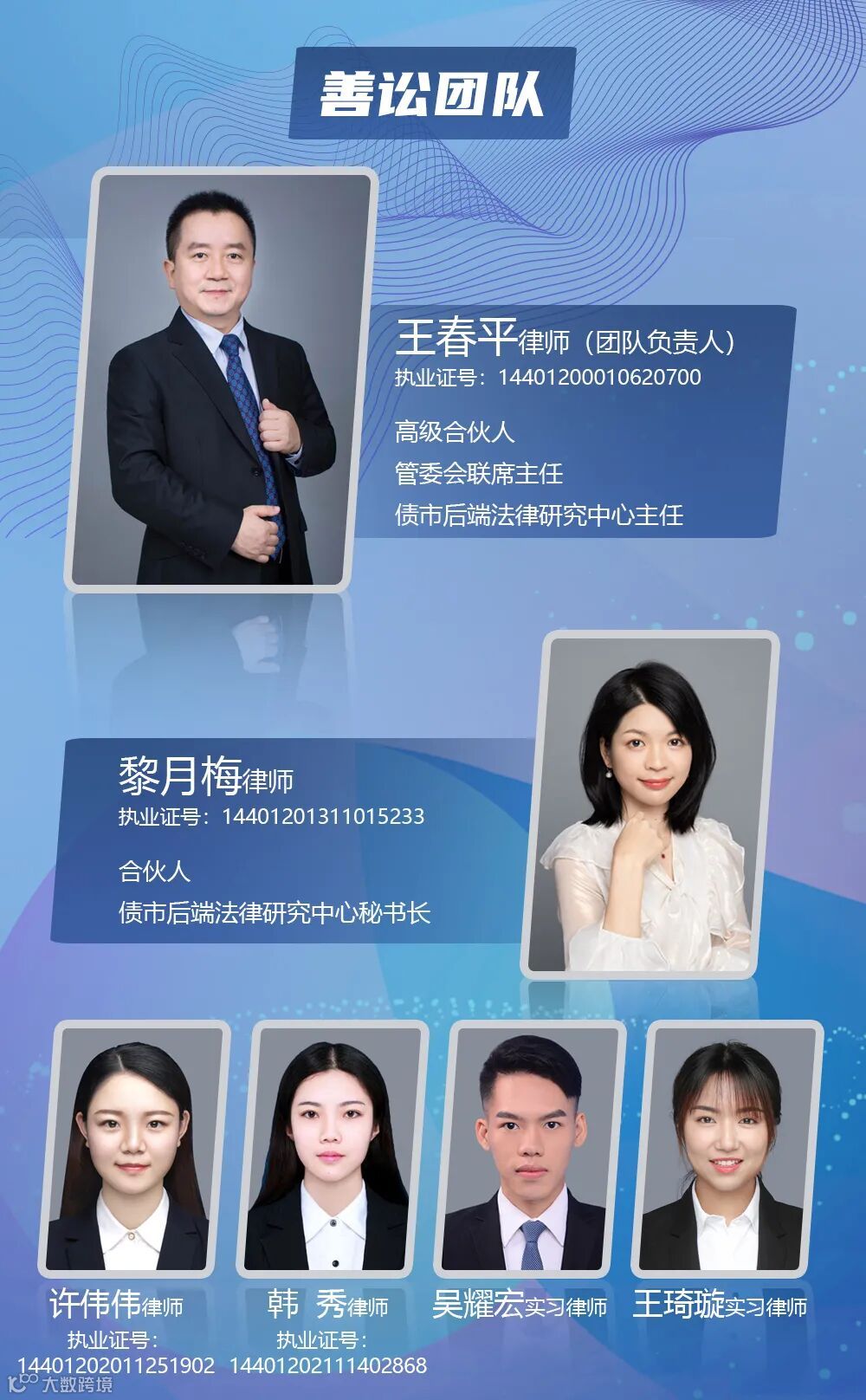 善讼团队由广信君达高级合伙人、债市后端法律研究中心主任王春平律师领衔,合伙人、债市后端法律研究中心秘书长黎月梅律师带队主办,拥有专职律师四人,实习律师二人,行政助理一人。团队以“让人们不讼而‘胜’”为使命,以“做最‘会’诉讼的律师”为愿景,坚持“善思、笃行、高远、协同、出奇、求精”核心价值观,致力于疑难复杂的不良资产交易处置、公司银行金融、房地产/建设工程、民商事诉讼/仲裁、民事及行政交叉案件等领域的研究与实务,经过长期的沉淀,善讼团队积累了丰富的实战经验,形成团队化、专业化、流程化的核心服务优势。