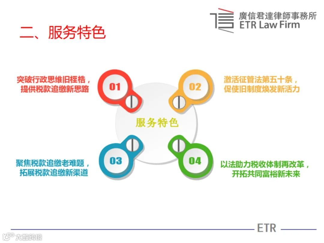 本法律服务产品立足深化税收征管改革,聚焦税收征管实践中面临的税款执行追缴难题,是一款旨在发挥律师专业作用,通过获取纳税人潜在或隐性财产线索、向纳税人权利义务承继人追缴、代位权诉讼、撤销权诉讼、损害公司债权人利益诉讼、启动强制清算和破产程序等多元化法律手段,帮助税务机关破解税款追缴难题的法律服务产品。