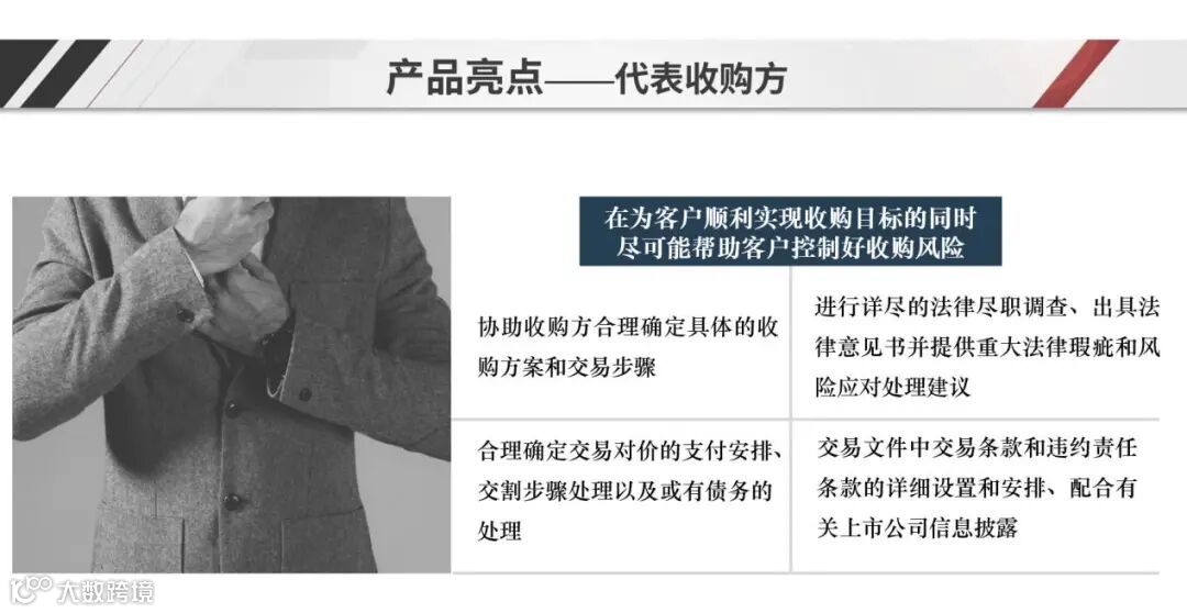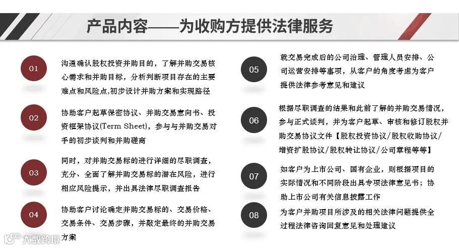 对被收购方而言,专业律师服务团队协助被收购方股东考虑被收购后的股权比例和公司治理安排、业绩对赌条件的设置和保护方案、原股东和核心管理层留任、超额实现业绩对赌后的管理层激励、股权转让所得税的税务安排以及公司被并购后的经营管理等方面事项的安排,并落实到最终的交易文件中去,能帮助被收购方达成最好的交易价格条件的同时,控制好业绩对赌风险以及被收购方股东被逼出局、交易失败等被收购项目中容易出现的风险。