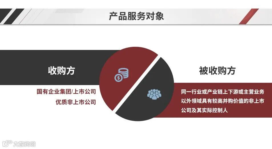 本产品主要面向国有企业集团/上市公司/优质非上市公司(代表收购方),以及与前述公司在同一行业(横向并购)、产业链上下游(纵向并购)或主营业务以外领域具有较高并购价值的非上市公司及其实际控制人(代表被收购方)。