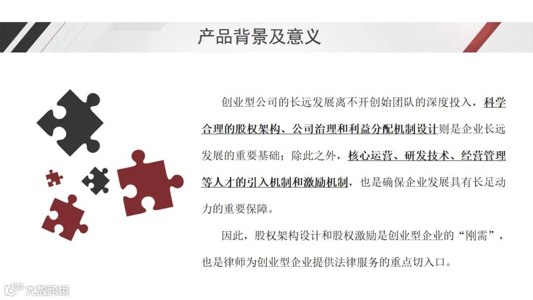 创业型公司的长远发展,离不开创始团队的深度投入和科学合理的股权架构、公司治理和利益分配机制设计;除此之外,核心运营、研发技术、经营管理等人才引入机制和激励机制,也是企业发展长足发展的重要保障。因此,股权架构设计和股权激励是创业型企业的“刚需”,也是律师为其提供法律服务的重点切入口。