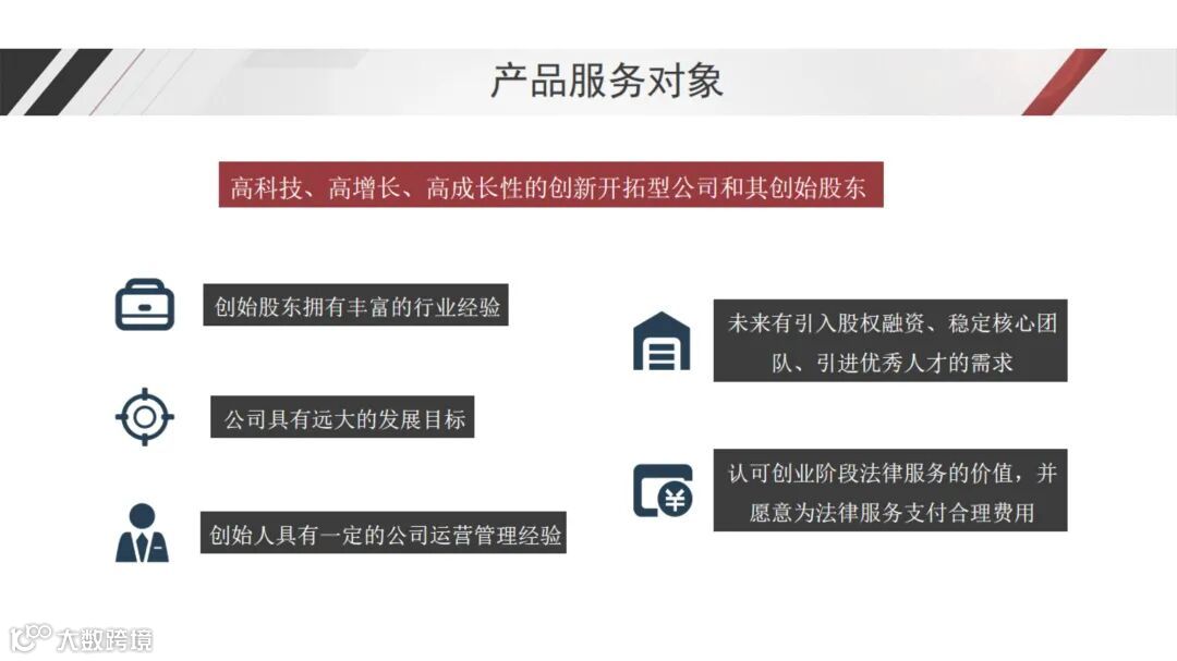 本法律服务产品主要面向处于创业阶段的高科技、高增长的创新开拓型公司与其创始股东。此类客户通常拥有某一行业或者领域的丰富专业经验和一定的公司运营经验、具有远大的公司发展目标,通常也面临后续股权融资、稳定核心团队、引进优秀人才的问题。为了公司更快更好发展,创始股东/创业型公司需要专业律师协助合理设计现有股东之间的股权架构,融资后的股权架构设想,以及公司核心团队和引进优秀人才的激励方案。