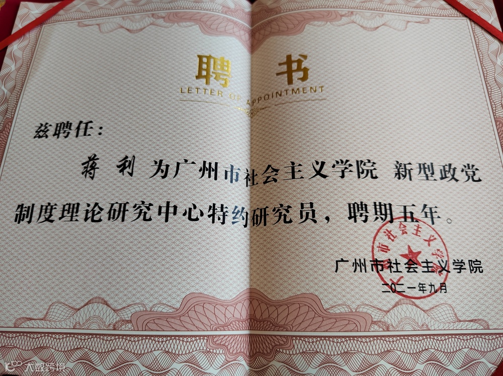 本所蒋利律师获聘为广州市社会主义学院新型政党制度理论研究中心特约研究员。