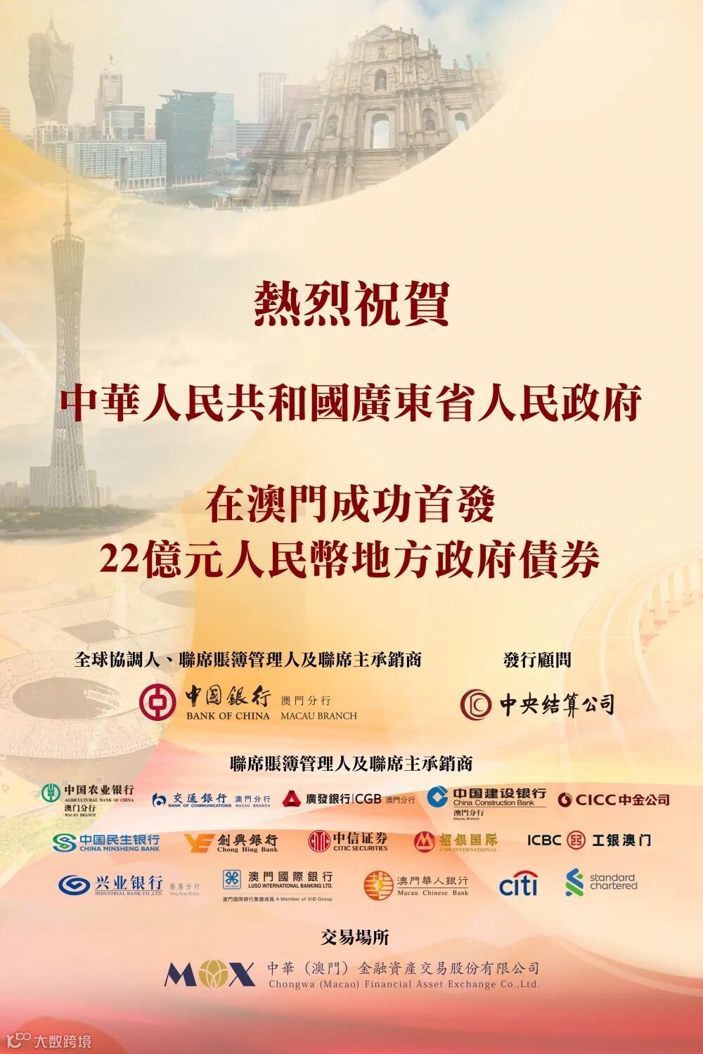 广信君达律师事务所担任中华人民共和国广东省人民政府(简称“广东省政府”)的发行人中国法律顾问,助力广东省政府于2021年10月12日在澳门特别行政区成功发行3年期22亿元离岸人民币地方政府债券,筹集资金将用于教育、科技、农业等领域。这是广东省政府在境外发行的首支地方政府债券,也是在澳门本地簿记发行、登记托管并上市交易的首支地方政府债券,更是澳门债券市场单次最大发行规模的债券。