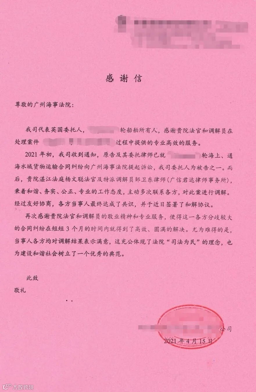 (原、被告事后分别向广州海事法院寄送了感谢信)
