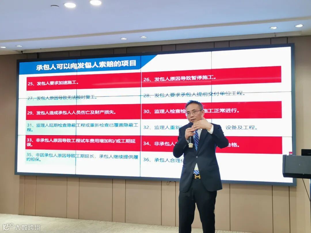 黎律师结合自身多年经办过的各类成功典型索赔案例,就工程索赔的概念、特征、索赔与签证区别、有效签证的构成要件、索赔程序、索赔项目、索赔应收集和固定的证据材料以及影响索赔成功的关键性因素等实务内容进行了深入浅出的专业讲授。