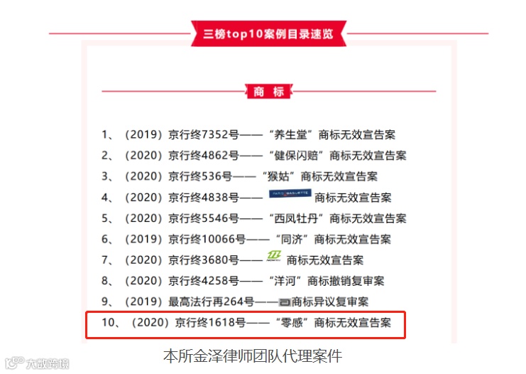 本所金泽律师团队代理(2020)京行终1618号“零感”商标无效宣告一案经评审投票,获评“2020年商标授权确权十大典型司法案例”。