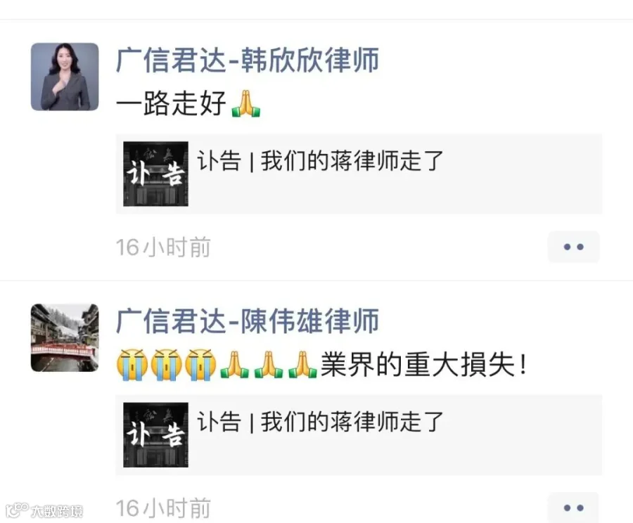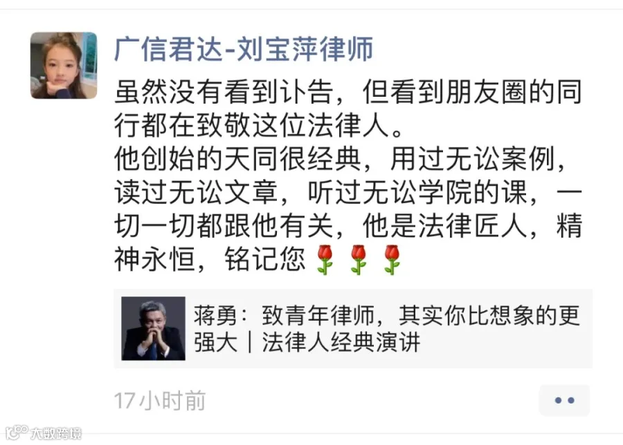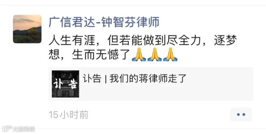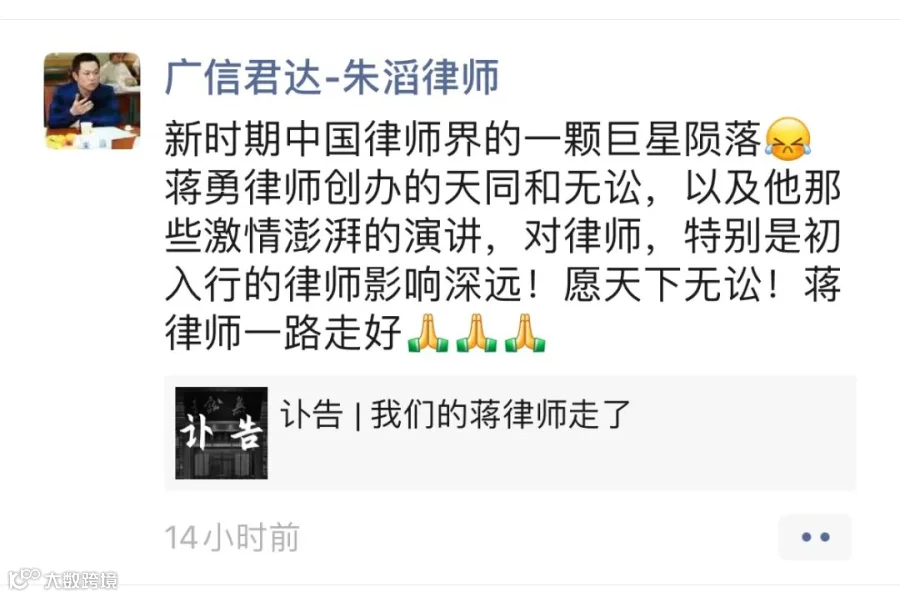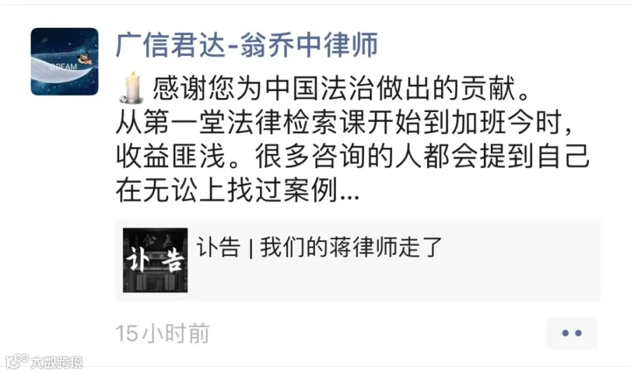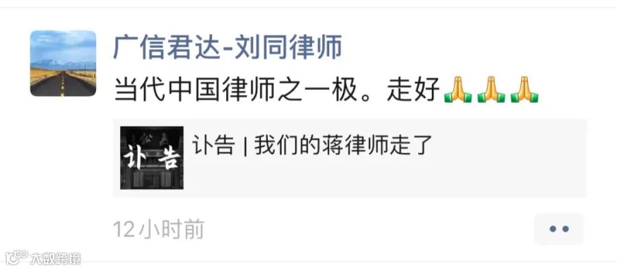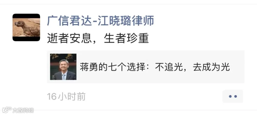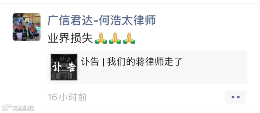 强壮之年,忽天人永隔。蒋勇律师的逝世,是律师界的巨大损失。在此向蒋勇律师致以崇高敬意和深刻缅怀,蒋勇律师千古!
