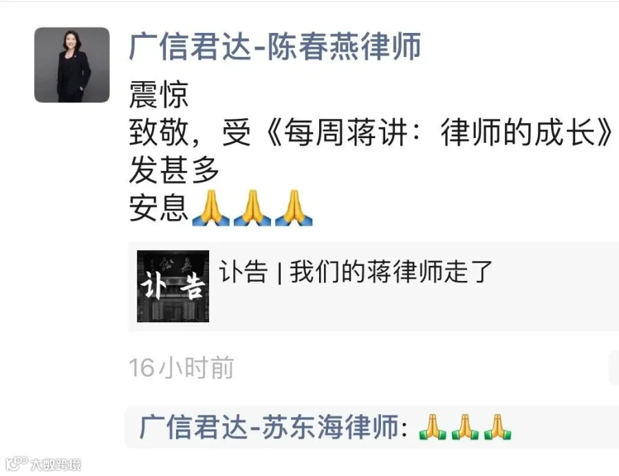 惊悉蒋勇律师逝世,广信君达律师事务所全体同仁万分悲痛,深感惋惜!在此谨致沉痛哀悼,并向蒋勇律师亲属和天同所全体员工表示诚挚慰问!