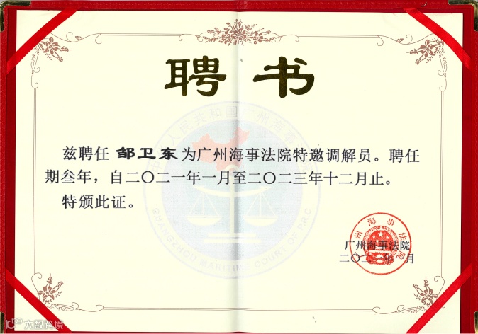 海事法院特邀调解员,体现了广州海事法院对广信君达及邹卫东律师在该法律领域专业性的认可与肯定。