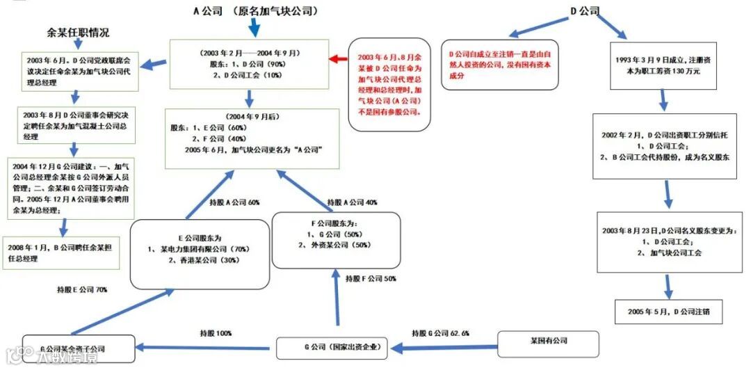 被告人余某,2003年6月经D公司(民营企业)党政联席会议研究决定任命为D公司的子公司加气块公司(A公司前身)担任代理总经理;同年8月,经D公司董事会研究决定任命为加气块公司(A公司前身)总经理;2005年,余某与国家出资企业G公司签订劳动合同,以G公司的外派人员身份担任A公司(国有参股公司)总经理;2008年1月,余某出任B公司(国有参股公司)总经理。为便于读者理解,可参考如下示意图。