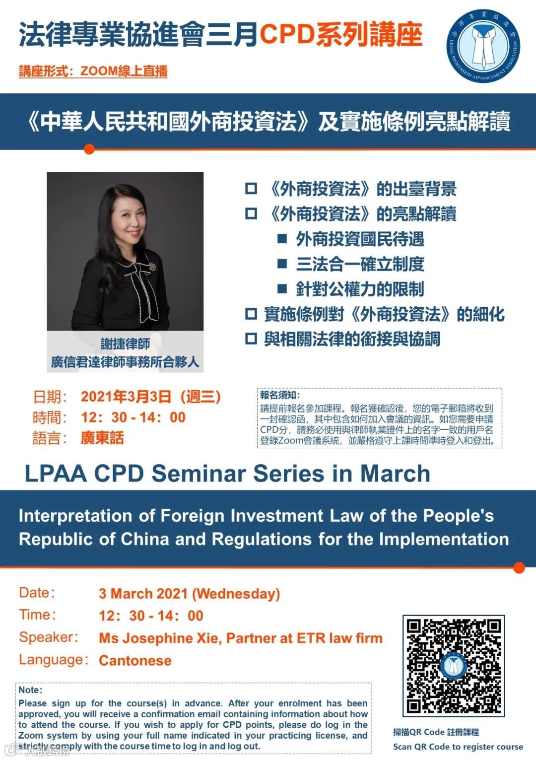 香港法律专业协进会为《外商投资法》及实施条例专题讲座发布的海报